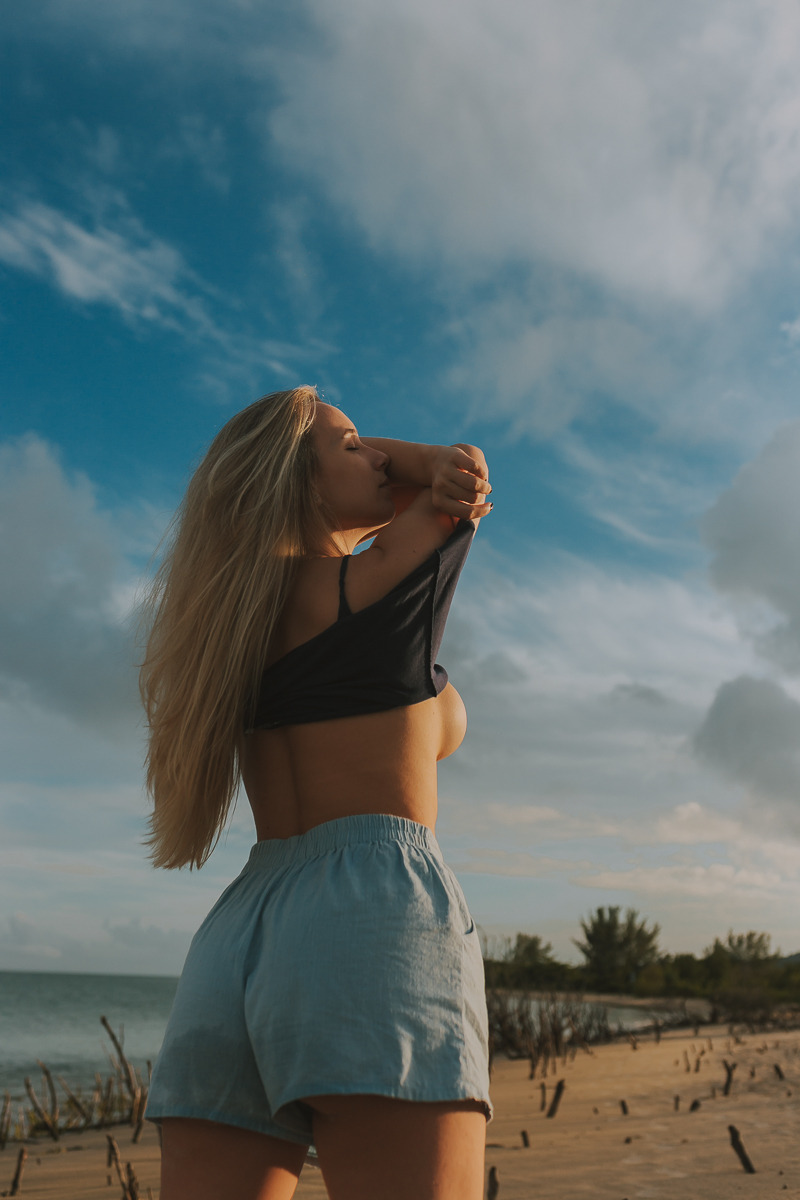 O processo é realizado individualmente para cada foto. Quando necessário, removo algumas imperfeições, sem tirar a naturalidade da modelo e da pele. Busco manter a riqueza dos detalhes em cada edição.